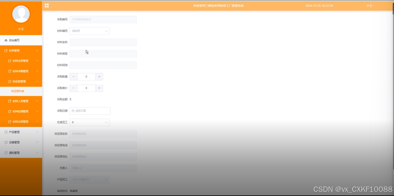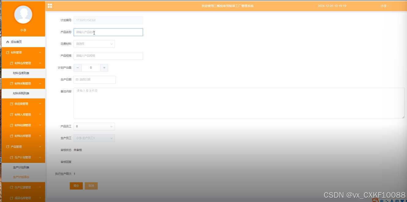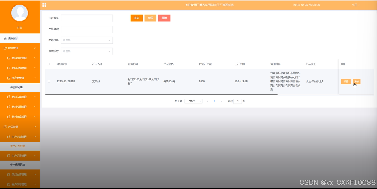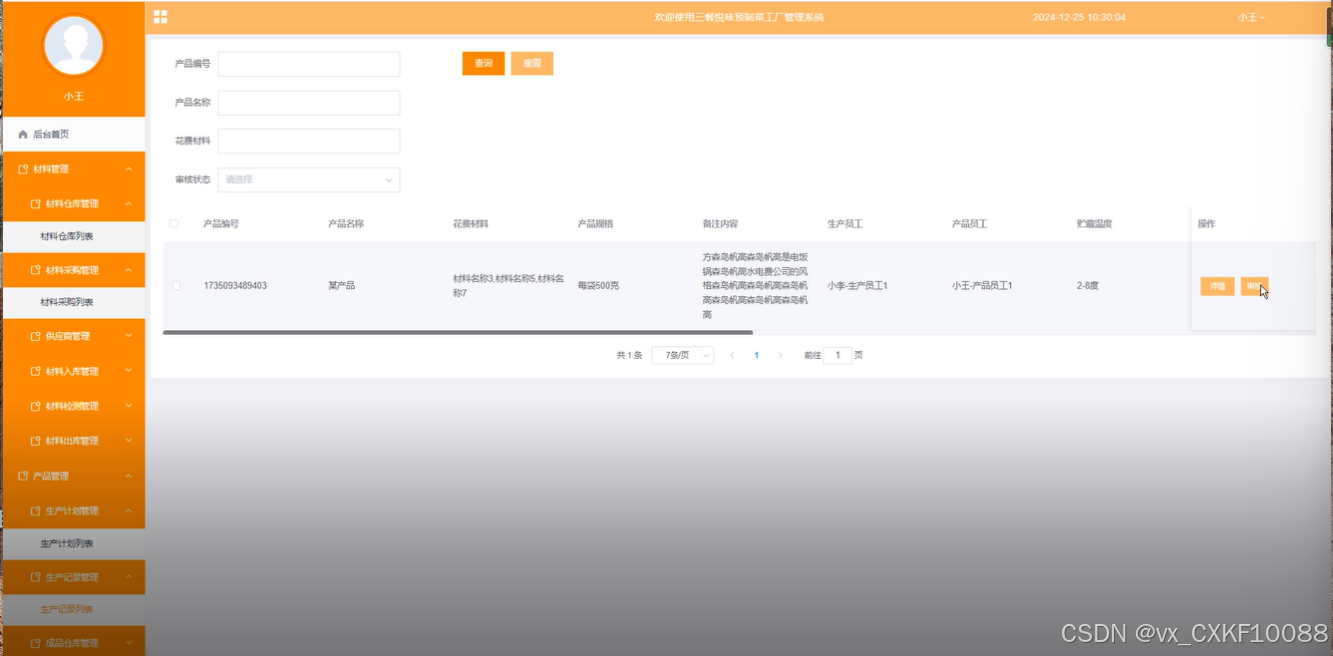 关键词:预制菜;Spring Boot;生产管理;材料管理;设备管理;后台管理