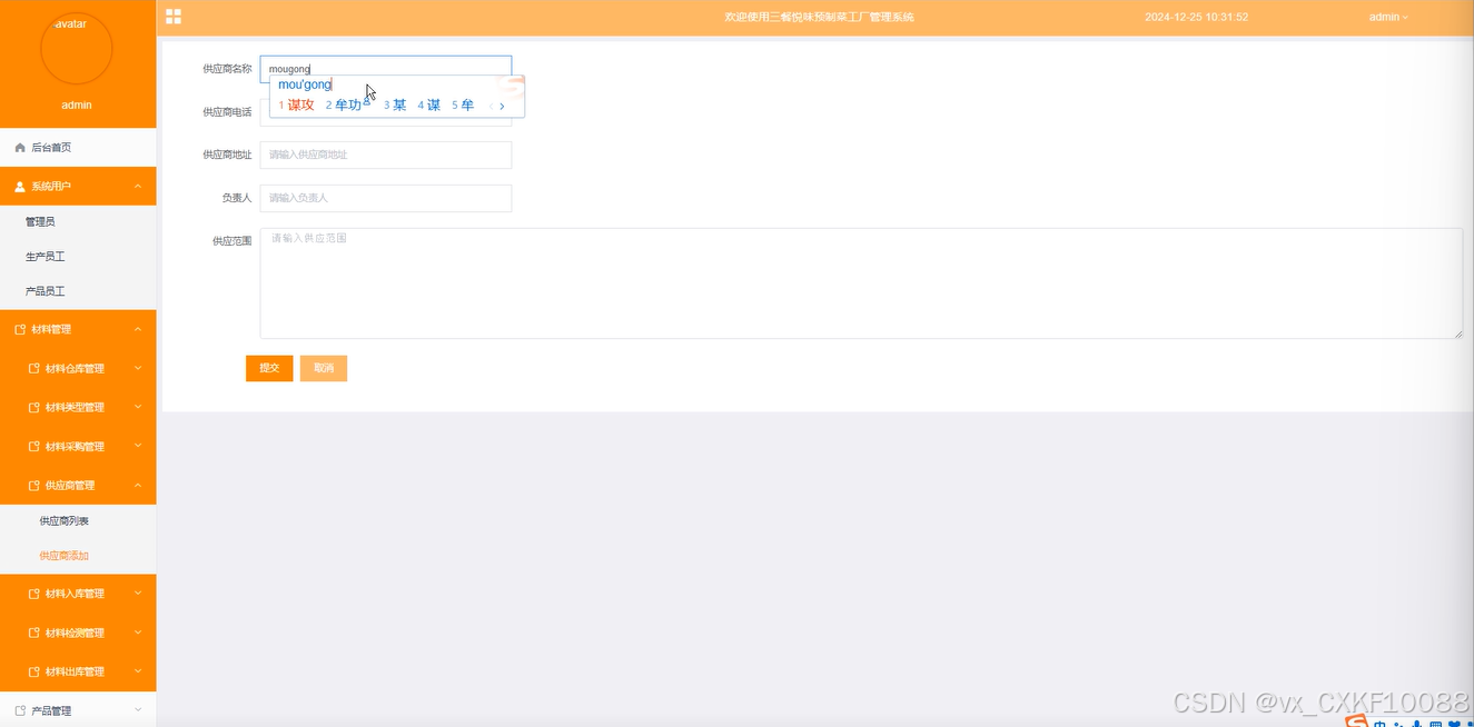 点击系统导航栏上的“供应商管理”菜单按钮,管理员可以对供应商信息进行增删改查等操作,生产员工和产品员工都可以查看。供应商添加页面如图5-7所示。