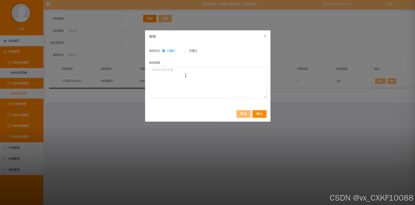 材料采购管理:管理员审核材料采购单,并根据需求审批采购计划。