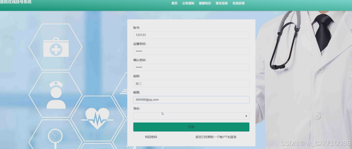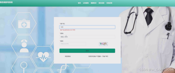 - 注册登录:游客可以通过注册成为患者用户,使用用户名密码可登录系统前台,使用系统功能。