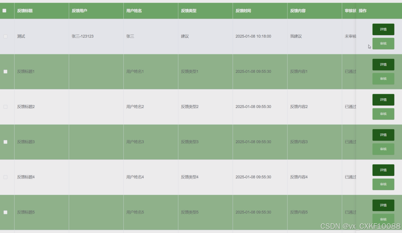 管理员可以对在线反馈进行管理,可以查看投诉或建议列表,点击详情可进行审核和回复操作。