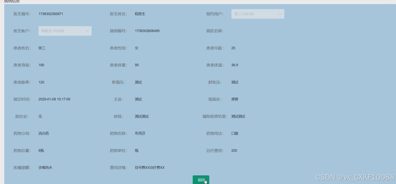 Technically, the use of Spring Boot simplifies the system development and configuration process, combined with MySQL database for data storage, Redis for cache management to optimize performance, and modern JavaScript frameworks such as Vue.js for the front-end to enhance user experience. By utilizing information technology to optimize the medical service process, improve the efficiency of medical resource utilization, enhance the patient's medical experience, and build an efficient and convenient medical service ecosystem. The system mainly includes multiple functional modules such as user management, doctor information management, department information management, case information management, appointment registration management, appointment change information management, and online feedback management.