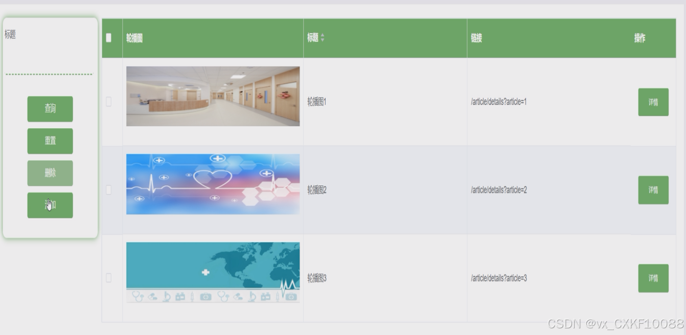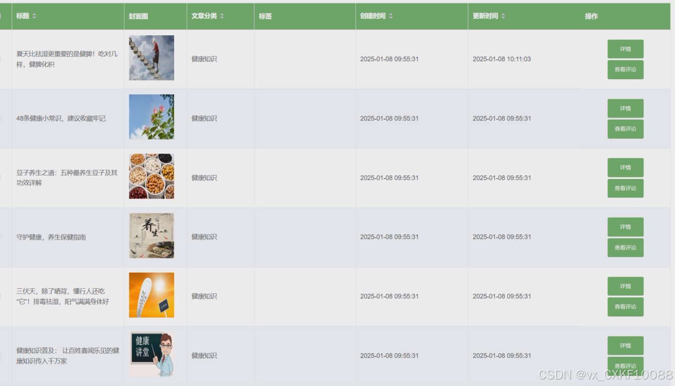- 健康知识:患者用户可查看管理员发布的所有健康知识信息,可点击查看详情,可进行点赞、收藏和评论操作。