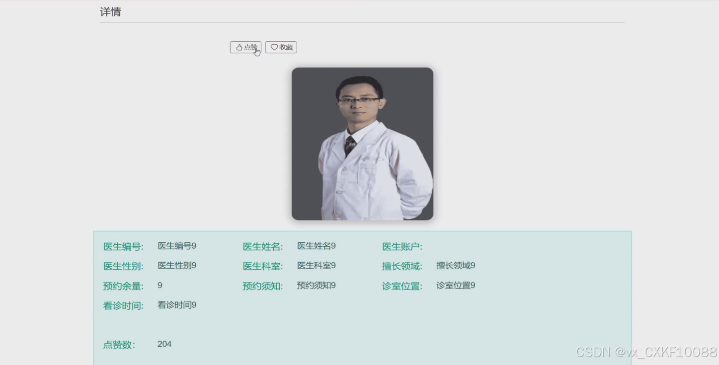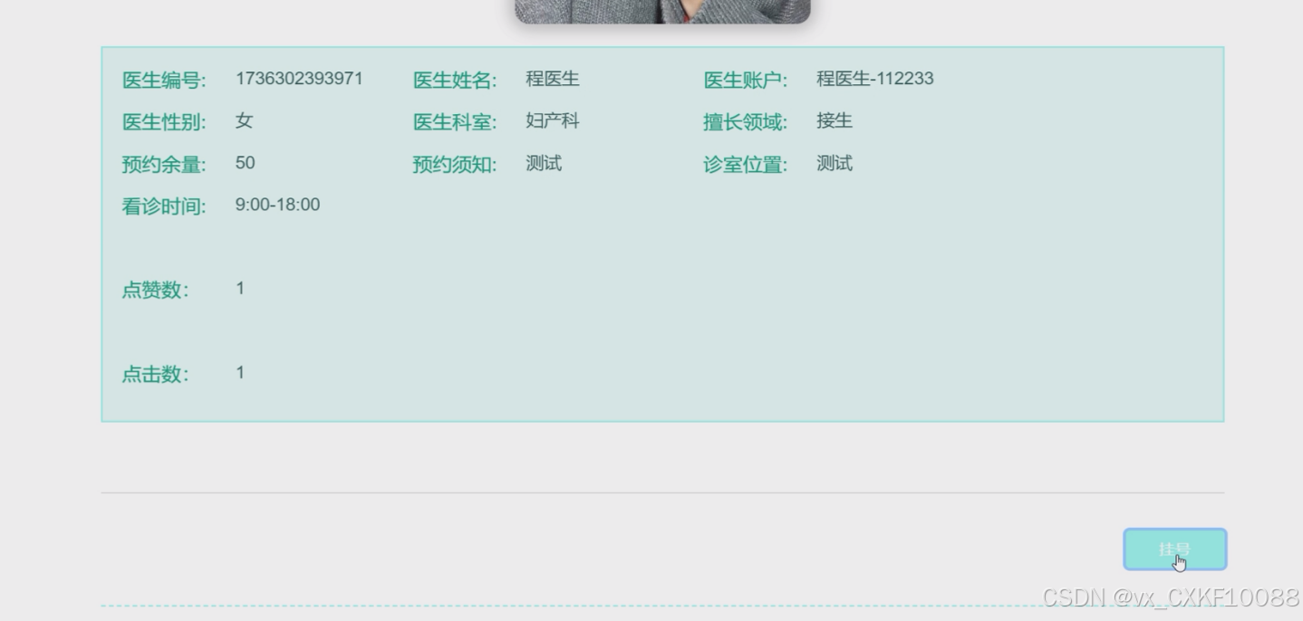 - 医生信息:展示医生信息列表,患者用户可以根据关键字进行搜索,点击图片可以查看医生详细信息,可进行点赞、收藏和评论操作。可点击挂号按钮,选择预约时间、人数以及填写预约备注等信息后提交挂号单。挂号单需要医院审核后才会
