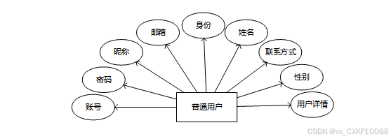 普通用户的信息包含账号、密码、昵称、邮箱、身份、姓名、联系方式等信息。实体属性图如下图所示: