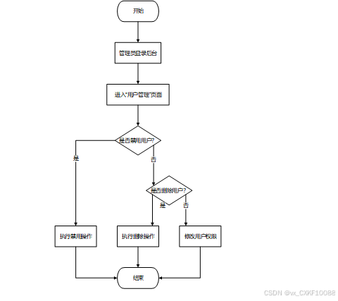 管理员登录后台后,进入“用户管理”页面,可以选择查看不同类别的用户(管理员、普通用户),并执行禁用、删除或修改权限等操作。流程图如下: