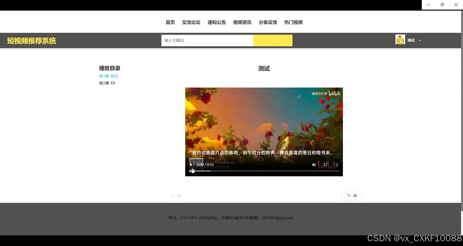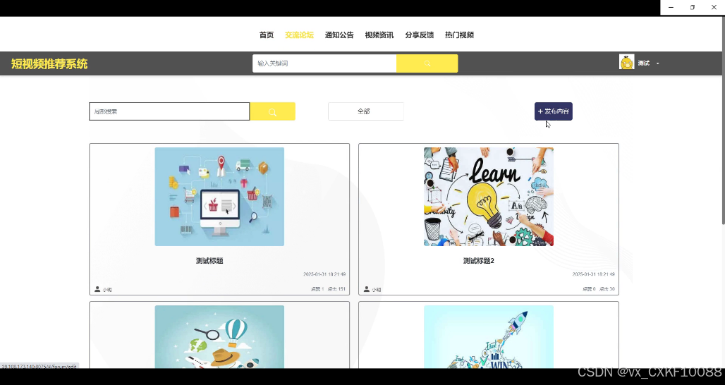 首页:提供轮播图展示平台推荐的短视频、视频资讯模块和协同过滤推荐系统,基于用户兴趣和行为推送热门视频。用户可以快速浏览推荐内容并进入播放界面。