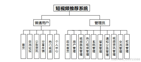 功能模块设计是系统开发过程中的重要阶段,将系统划分为不同的模块,每个模块负责完成特定的功能或任务。短视频推荐系统由多个功能模块组成,每个模块下又包含具体的功能操作。功能模块图如下图所示。
