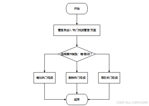 管理员进入“热门视频管理”页面,可以选择增、删、改热门视频。添加视频时,选择上传或选择推荐视频内容,修改视频时可以修改信息,删除视频则移除视频。流程图如下: