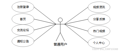 普通用户可以在首页浏览轮播图、视频资讯和个性化的热门视频推荐,并参与交流论坛、查看通知公告和视频资讯。用户还可分享视频、提供反馈、管理个人信息、收藏和评论等,享受定制化的社交互动和观看体验,方便快捷地进行视频观看与交流。普通用户角色用例如下图所示。