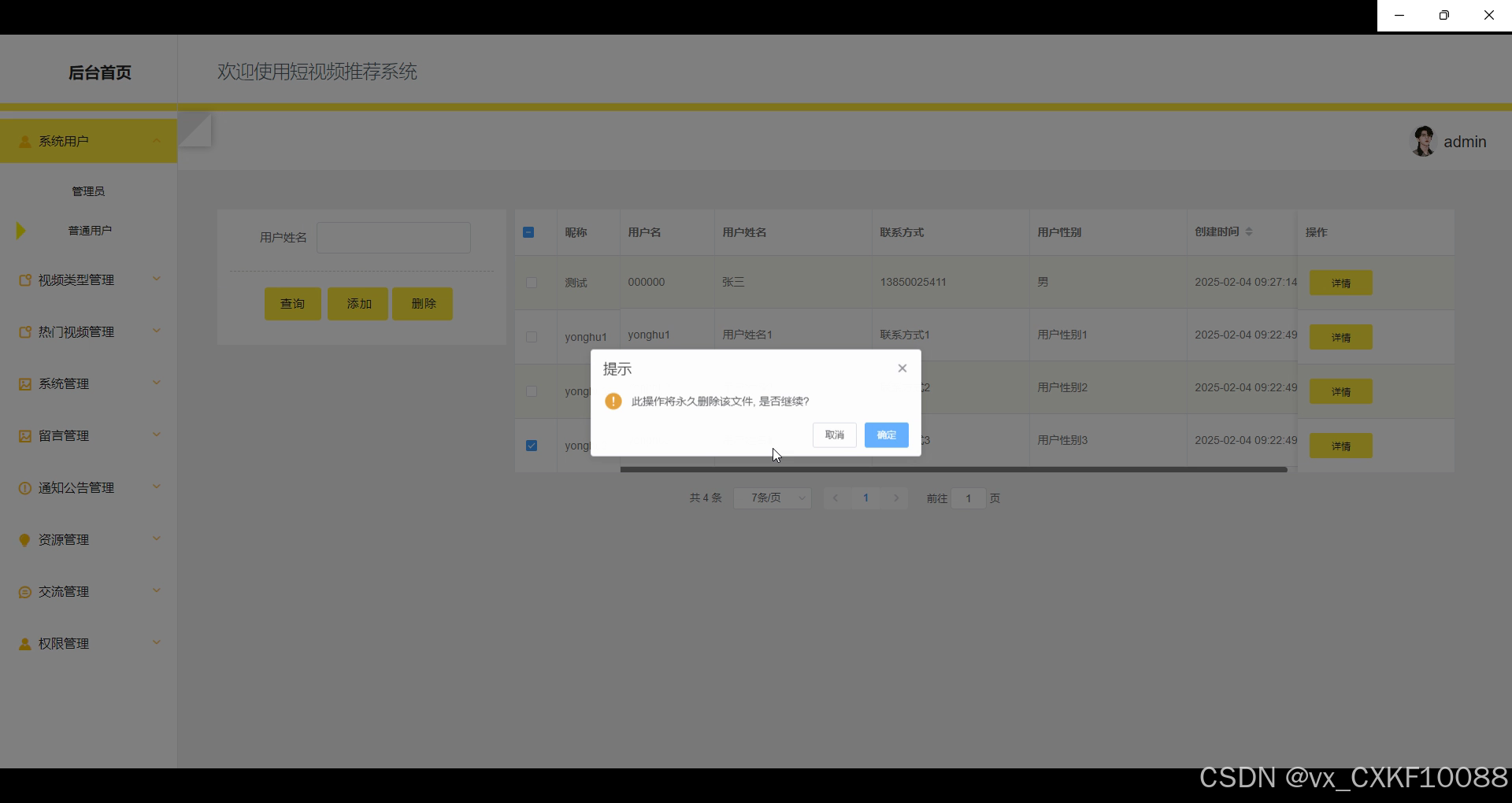管理员可以在“热门视频管理”页面进行增、删、改、查等操作,以便灵活管理平台上的热门视频。管理员可以手动添加热门视频,删除不合适的内容,修改视频推荐状态,或者查看当前热门视频列表。界面如下所示。