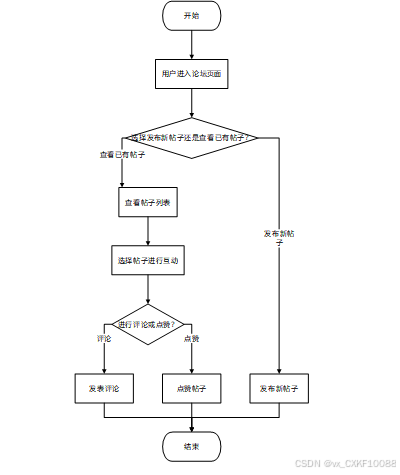 用户进入论坛页面,选择发布新帖子或者查看已有帖子。用户可以进行评论或点赞,与其他用户互动。流程图如下: