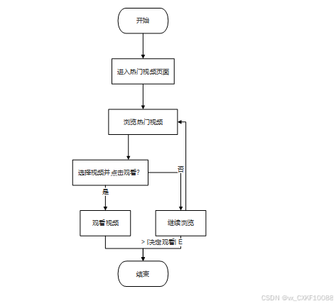 用户进入热门视频页面,浏览当前最受欢迎的视频,点击视频进行观看。系统根据用户的观看记录,推荐相关视频。流程图如下: