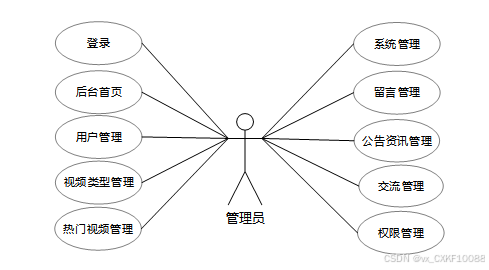 管理员负责后台管理,包括用户、视频类型、热门视频、通知公告、留言和视频资讯的管理。管理员还可更新平台轮播图、敏感词过滤,审核评论和管理用户权限,确保平台内容健康、有序。系统管理和交流管理功能保障平台稳定运行并优化用户体验。管理员角色用例如下图所示。