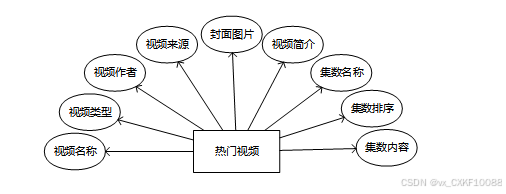 热门视频的信息包含视频名称、视频类型、视频作者、视频来源、封面图片、视频简介、集数名称、集数排序、集数内容等信息。实体属性图如下图所示: