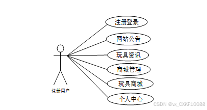 系统用例分析的核心价值在于深度解构系统业务单元间的交互诉求与行为路径,通过精准捕获和结构化映射多维度用户情境,构建用户全生命周期操作模型。该方法体系有效构建用户操作链路与交互触点的认知框架,为技术实现提供行为驱动的设计依据,最终实现服务体验的精准提升。注册用户角色用例如图2-4。