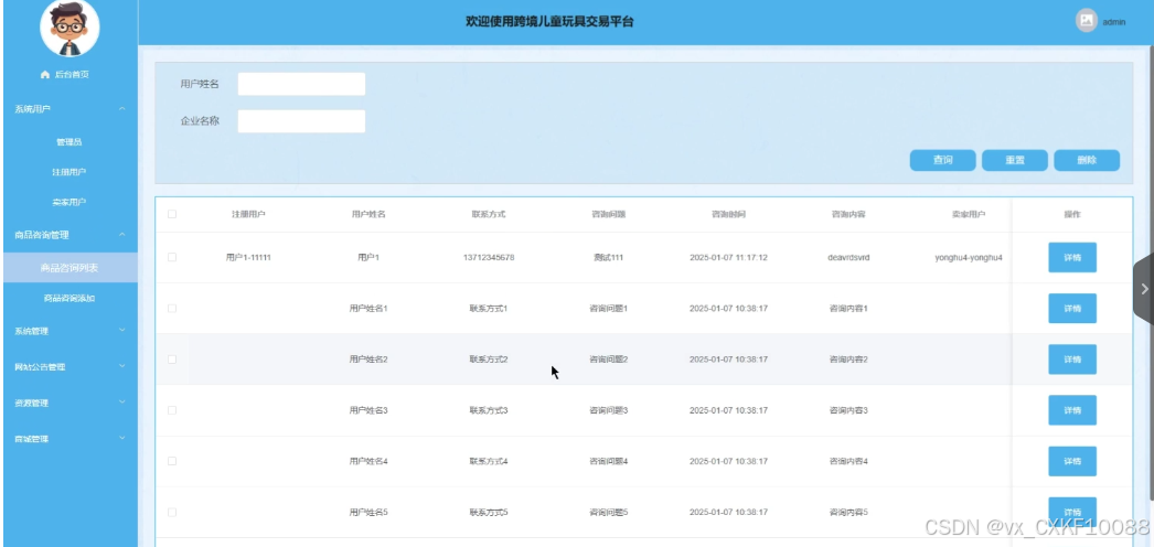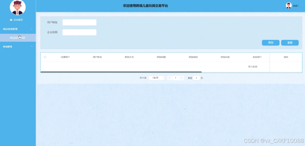 (1)商品咨询管理:卖家用户拥有查看和删除商品咨询列表的权限,审核并回复用户咨询。