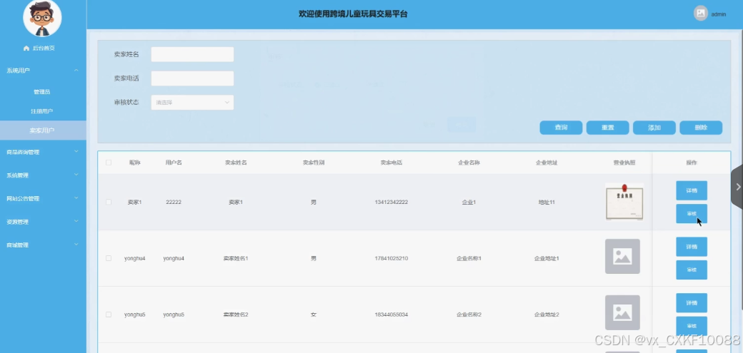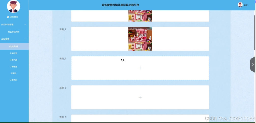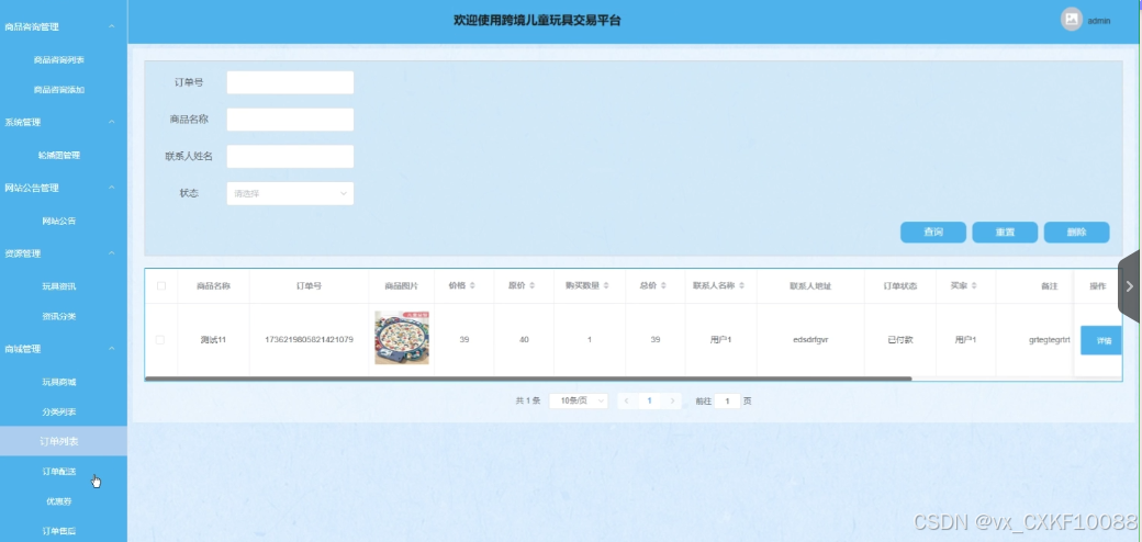 商城管理:卖家用户拥有查询、重置、添加、删除玩具商城的功能,也拥有查询、添加分类列表、订单列表、订单配送、优惠券、订单售后的详细功能。