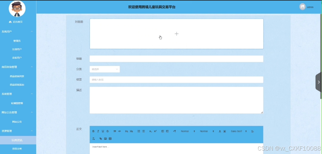 (6)资源管理:管理员拥有查看、编辑玩具资讯列表的权限,同时也可以添加新的资讯分类。
