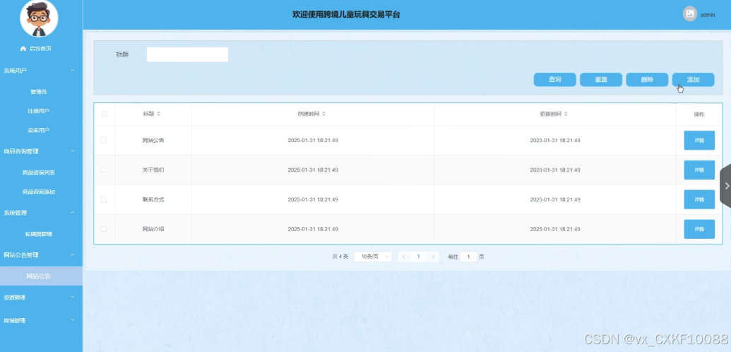 网站公告管理:管理员负责系统公告的全面管理,包括查看、编辑及删除公告内容。界面如图4-12所示。
