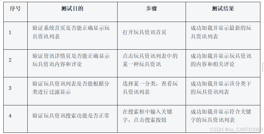 经过对系统用户登录、玩具资讯展示及密码修改三大核心功能的全面测试,系统展现出了优异的综合性能。具体而言,用户登录流程顺畅无阻,能够顺利接入系统;玩具资讯展示功能完备,不仅准确呈现了推荐列表、资讯详情及评论内容,还灵活支持了分类筛选、关键字检索及排序操作,极大提升了用户体验。此外,密码修改功能亦经严格验证,用户能够便捷地访问密码修改页面并顺利完成密码更新。综上所述,系统各项功能均运行正常,充分满足了预设目标,顺利通过了系统测试阶段的各项考验。