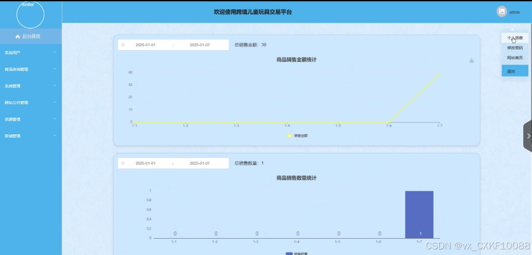 后台首页:管理员具备管理个人信息的权限,涵盖编辑个人资料、更换个人头像以及修改账户密码等多项操作,查看商品销售金额、数量统计图。界面如图4-9所示。