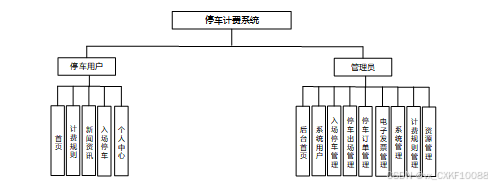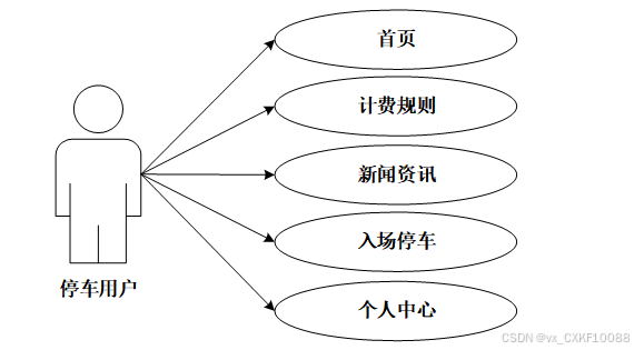 停车用户的功能包括首页、计费规则、新闻资讯、入场停车、个人中心(个人首页、入场停车、停车出场、停车订单、电子发票、收藏)。