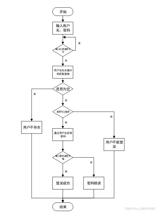 用户输入用户名和密码后,系统先检查输入是否为空,再验证用户名是否存在,若存在则通过用户名获取密码并校验。若密码正确则登录成功,否则提示密码错误。若用户名不存在或无法登录,提示用户操作无效。如图3-4所示。