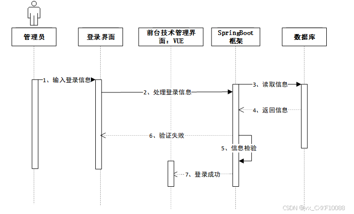 管理员输入登录信息后,登录界面将信息传递至前台管理界面,随后通过SpringBoot框架读取数据库中的用户信息并返回。系统验证信息,若验证成功则登录成功,若验证失败则返回错误提示。登录时序图如图4-4所示。