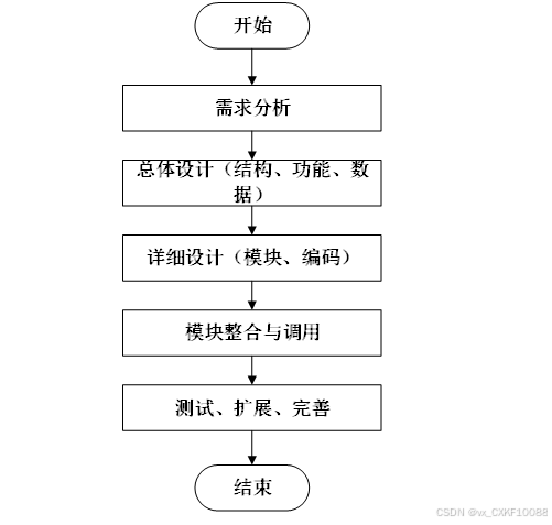 系统开发流程的主要步骤,从需求分析到系统完成的全过程。流程包括需求分析、总体设计(结构、功能、数据)、详细设计(模块、编码)、模块整合与调用,以及测试、扩展和完善,最终完成系统的开发。本系统的开发流程如图3-3所示。