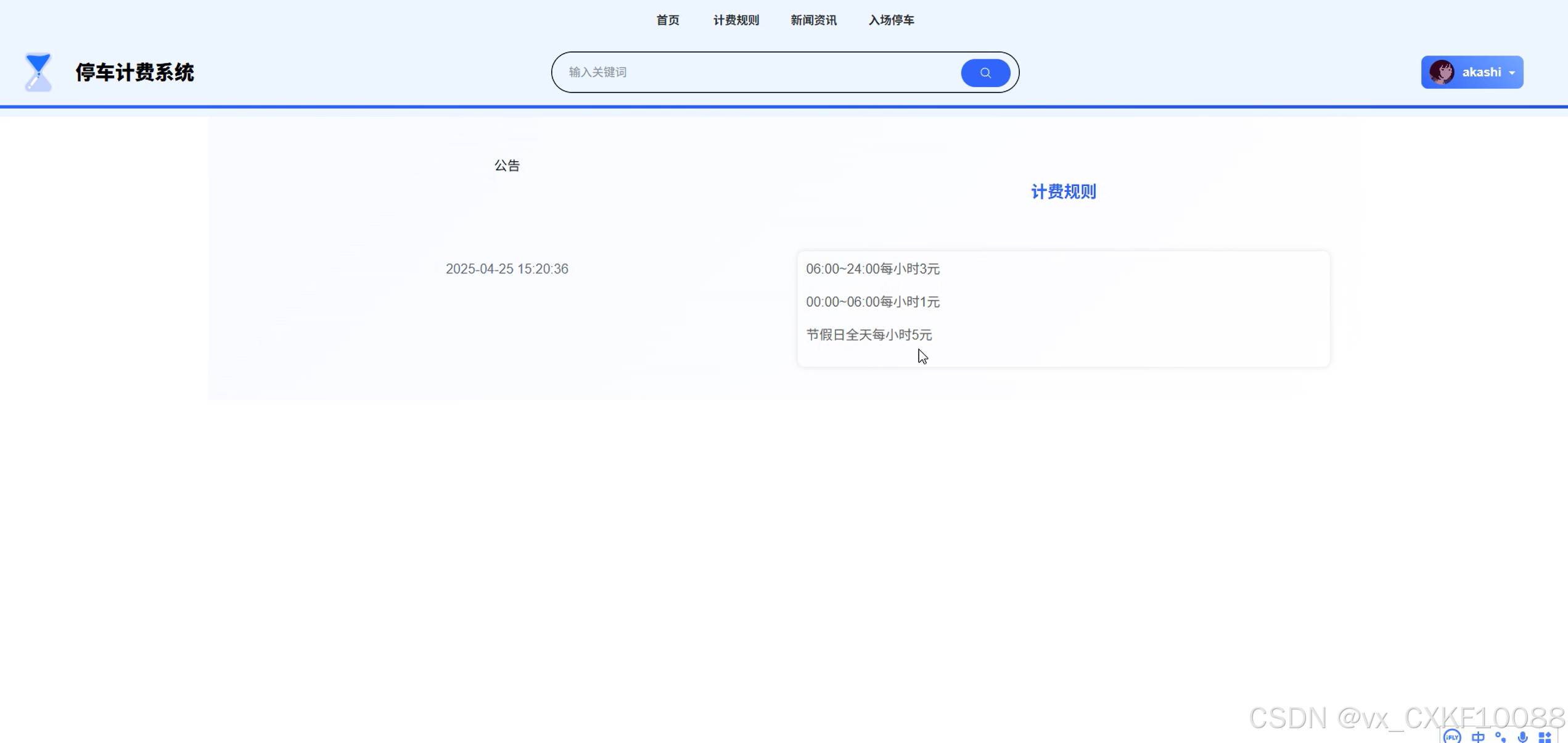随着城市化进程的加快,城市停车问题日益突出,传统的人工停车管理方式不仅效率低下,还容易出现错漏。为应对这一挑战,本研究基于 JavaScript 技术,引入 Spring Boot 框架,设计并开发了一套停车计费系统,以实现停车管理的自动化与智能化。该系统涵盖停车用户和管理员两大角色,针对停车用户,提供包括首页展示、计费规则查询、新闻资讯浏览、入场停车操作以及个人中心管理在内的便捷服务;对于管理员,则设有后台首页,支持系统用户管理,以及入场停车、停车出场、停车订单、电子发票的全流程管理,同时具备系统管理、计费规则制定与调整、资源管理等功能,并通过 iframe 实现车牌识别接入,确保车辆信息的准确获取。在系统设计与开发过程中,深入分析了停车管理业务流程与需求,运用 JavaScript 实现前端交互,借助 Spring Boot 框架搭建后端服务,以实现前后端分离的架构设计。系统经测试运行稳定,操作简便,能够有效提升停车管理效率,缩短车辆进出时间,提高车位利用率,为缓解城市停车难题提供了有力的技术支持。
