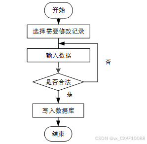 用户首先选择需要修改的记录,输入修改后的数据,系统判断输入数据是否合法。若数据不合法,提示重新输入;若数据合法,则将修改后的数据写入数据库,完成操作后流程结束。修改信息流程图如图3-7所示。