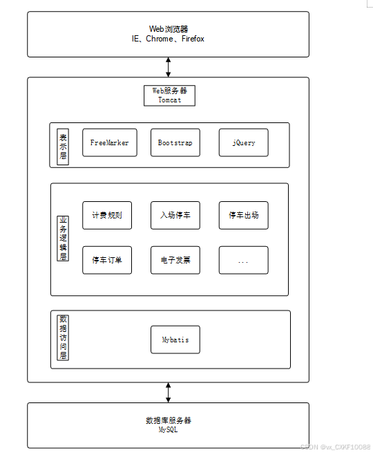 系统由表现层、业务逻辑层、数据访问层和数据库服务器组成。表现层通过浏览器(如IE、Chrome、Firefox)与用户交互,采用FreeMarker、Bootstrap、jQuery等技术实现界面呈现。业务逻辑层负责处理系统的核心业务逻辑,通过分模块设计实现功能分离。数据访问层使用MyBatis框架连接数据库,执行数据的增删改查操作。数据库服务器采用MySQL进行数据存储和管理,为系统提供稳定的数据库支持。整个架构通过Tomcat服务器完成用户请求的接收和处理,确保系统的高效运行[8]。整个系统架构如图4-1所示。