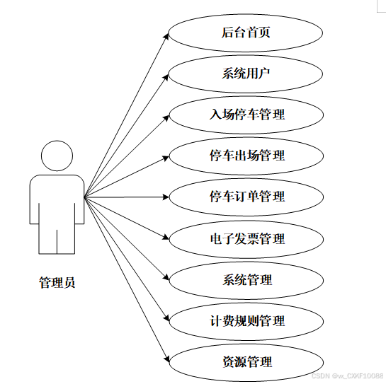 管理员的功能包括后台首页、系统用户(管理员、停车用户)、入场停车管理、停车出场管理、停车订单管理、电子发票管理、系统管理(轮播图管理)、计费规则管理、资源管理(新闻资讯、资讯分类)。