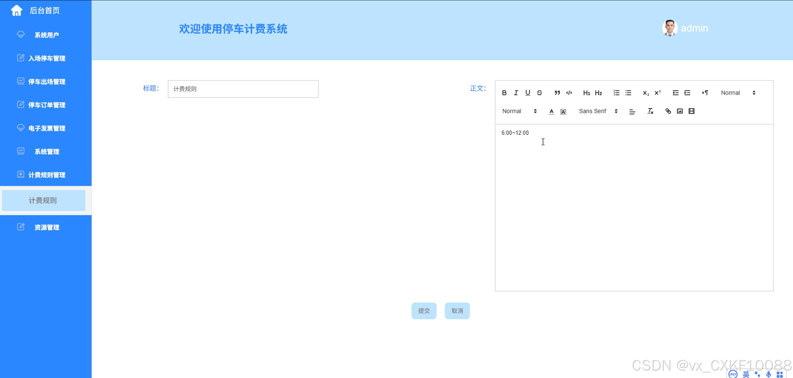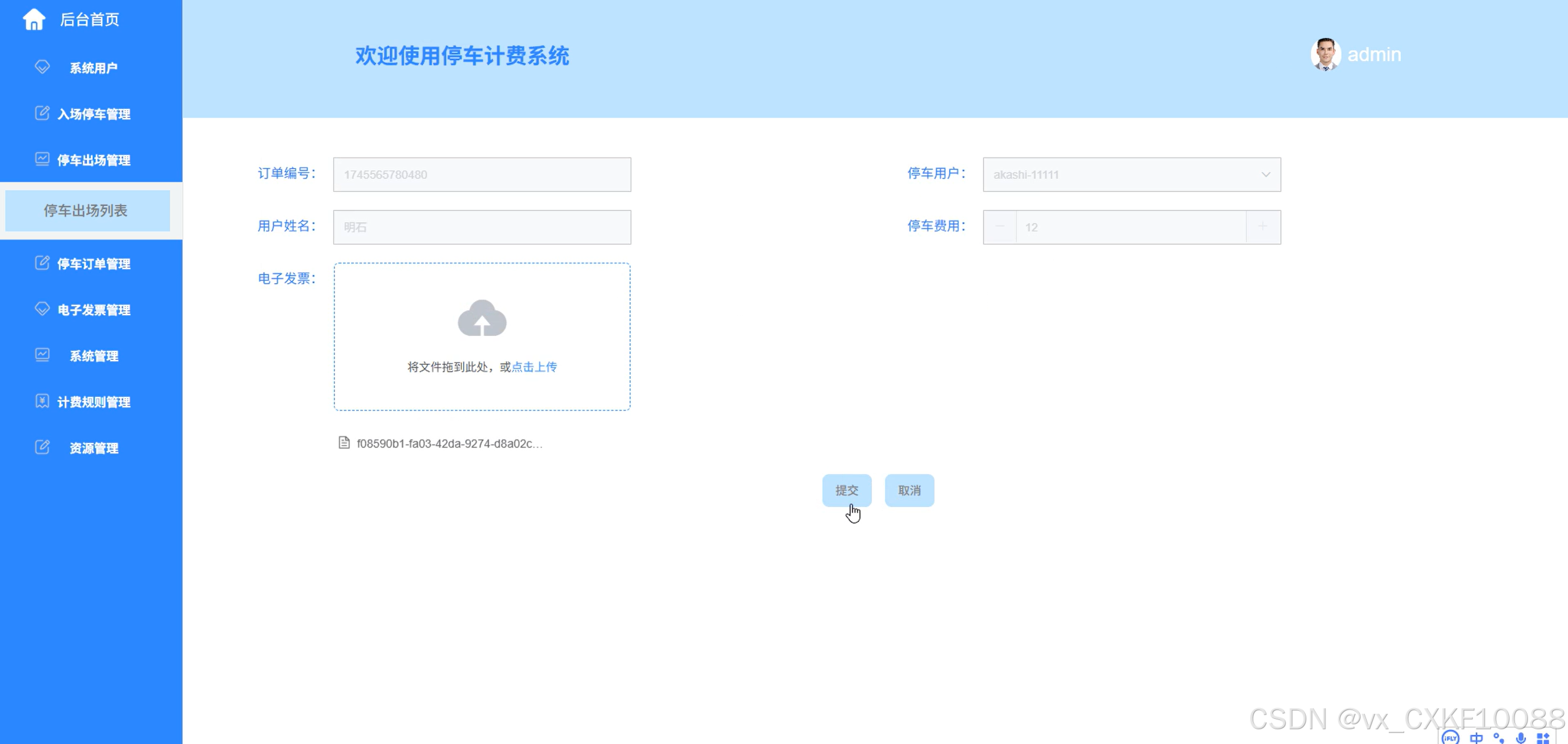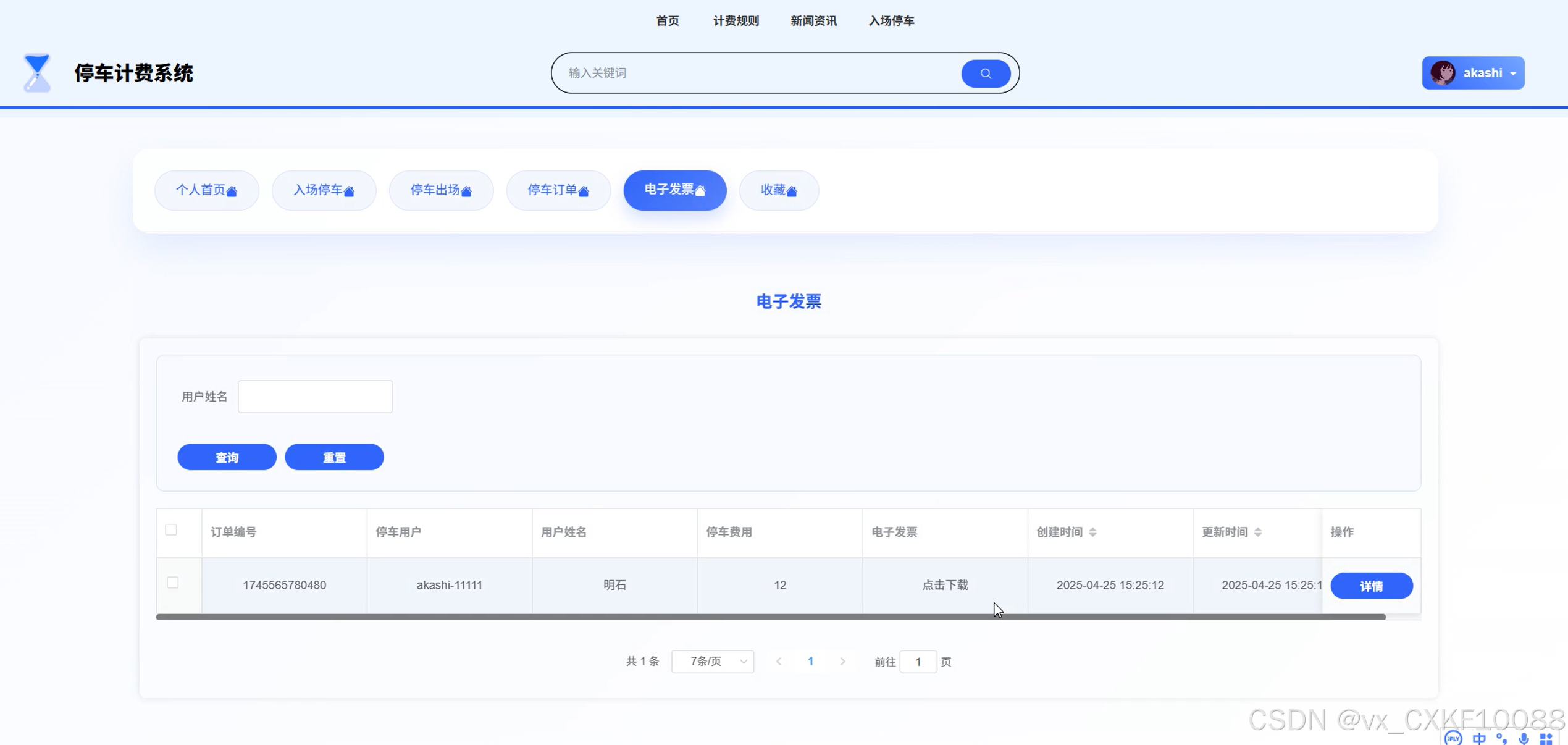 停车计费系统在解决城市停车管理问题方面取得了显著成效。系统通过合理划分停车用户和管理员的功能模块,实现了停车管理的自动化与智能化。停车用户可以便捷地查询计费规则、获取新闻资讯、进行入场停车操作,并在个人中心管理停车出场、查看停车订单、申请电子发票及进行收藏等操作。管理员则通过后台高效管理用户信息、停车流程、发票生成与资源分配,并通过iframe接入车牌识别技术,确保车辆信息的精准录入与管理。该系统显著提高了停车管理效率,缩短车辆进出时间,优化车位利用率,为缓解城市停车压力提供了有力的技术支持。经过实际应用验证,系统运行稳定,操作简便,有效提升了停车场的运营效率和用户体验,具有良好的实际应用价值与推广前景。