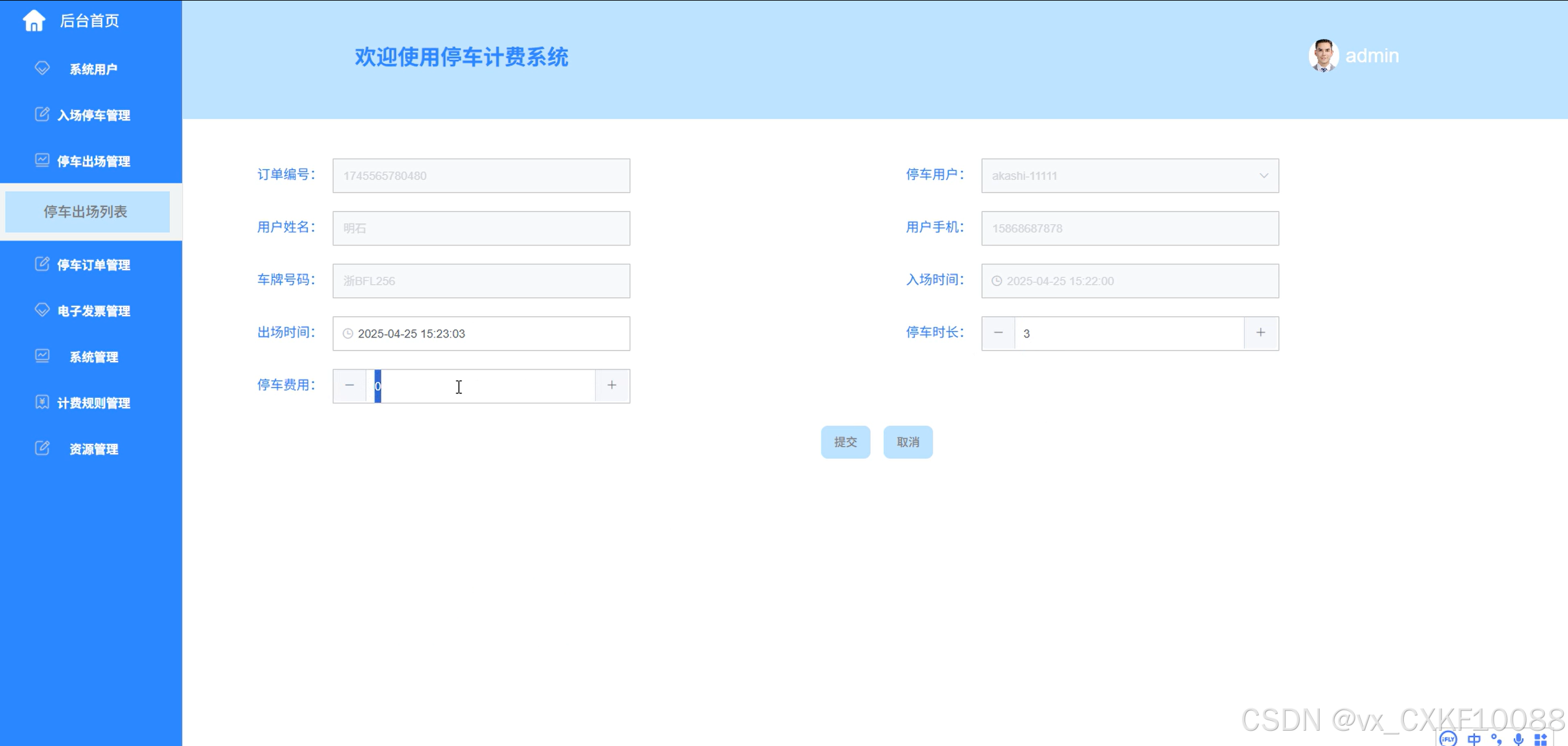 管理员登录停车场管理系统,对停车用户的费用进行结算。停车费用结算功能保障停车场营收数据准确,为财务核算提供依据。停车费用结算界面如图5-5所示。
