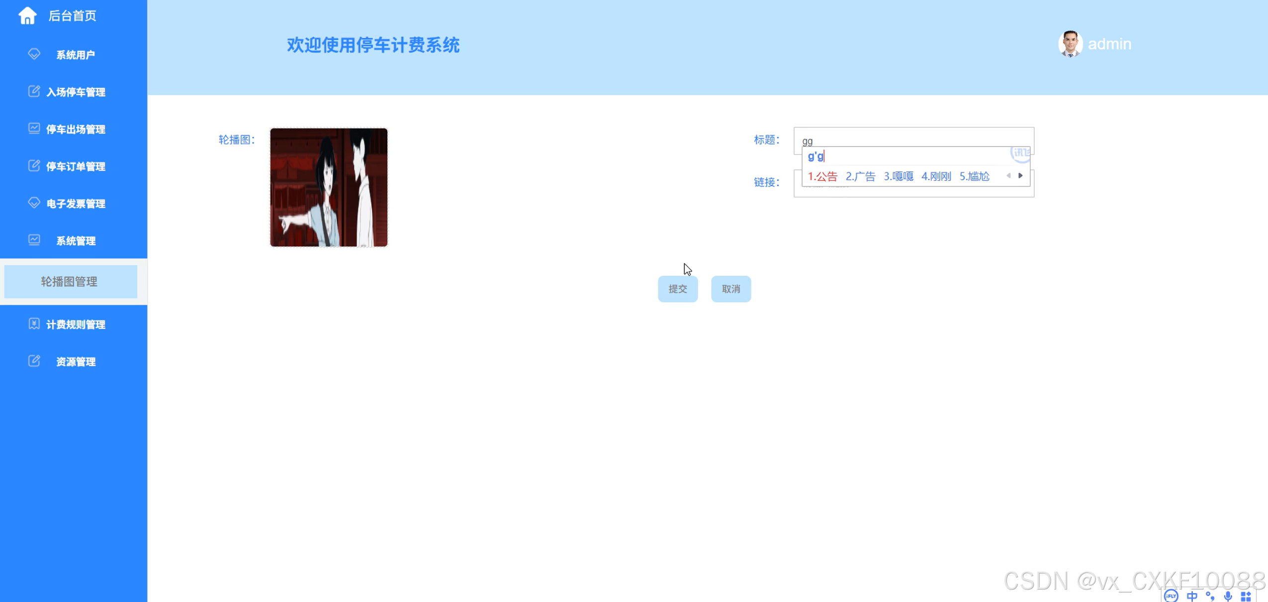 管理员在轮播图管理界面,把控停车场宣传展示。可上传新图片或视频用于轮播,如优惠活动宣传、停车场新服务介绍、安全提示等内容。设置轮播顺序,调整切换时长,突出重点信息。定期更新轮播素材,保持内容吸引力与时效性。轮播图管理界面如图5-7所示。