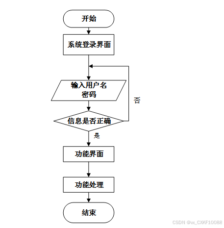 用户首先进入系统登录界面,输入用户名和密码后,系统验证信息是否正确。若验证失败,返回登录界面重新输入;若验证成功,则进入功能界面,执行相应功能处理后结束操作流程。操作流程如图3-5所示。