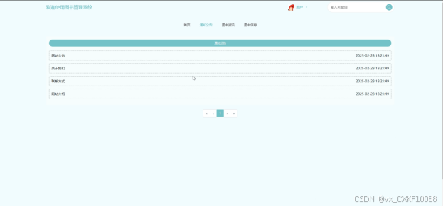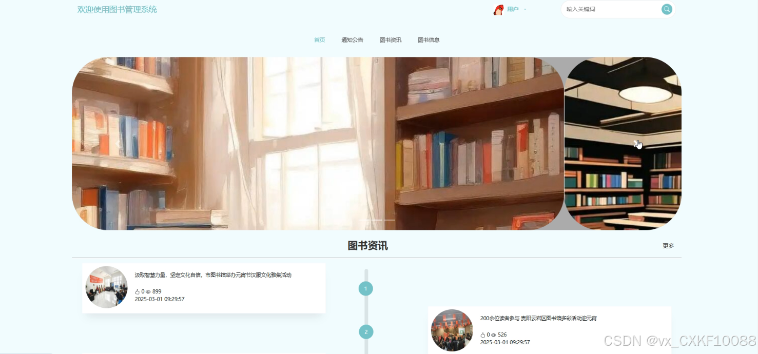 - 首页:首页是用户进入系统后看到的第一个页面,提供快速入口和导航,展示最新或最热门的图书资讯、通知公告等,方便用户快速了解系统动态和获取所需信息。