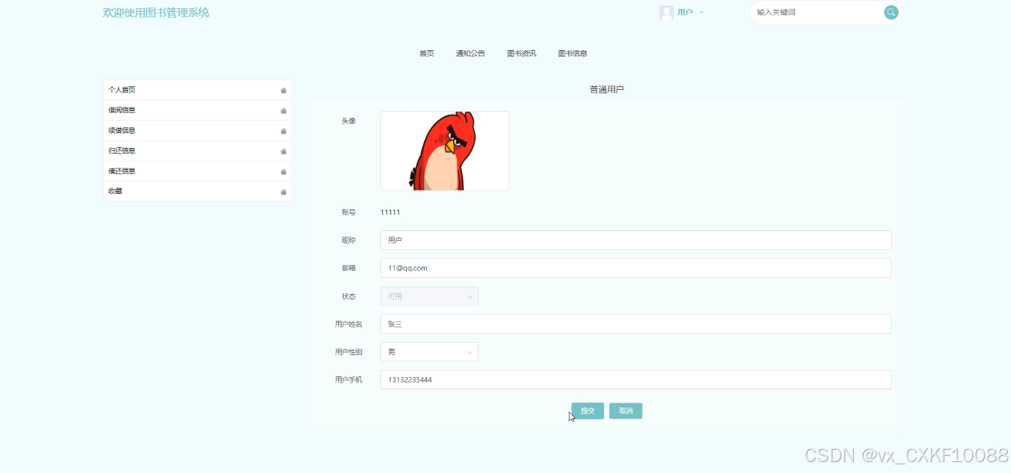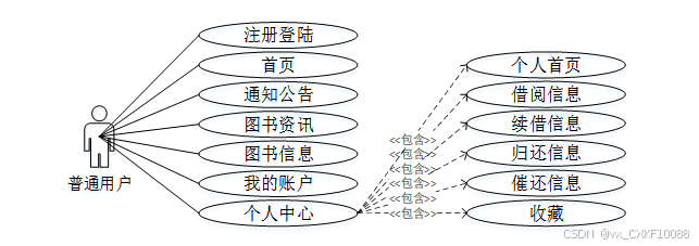 - 个人中心:个人中心是用户管理个人信息和借阅记录的集中地,包括个人首页、借阅信息、续借信息、归还信息、催还信息和收藏。用户可以在这里查看自己的借阅历史、进行图书续借、了解即将到期或已逾期的图书,并管理自己的收藏列表。