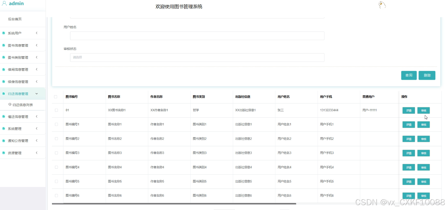 - 归还信息管理:归还信息管理功能使管理员能够跟踪和管理图书归还情况。管理员可以删除或查询归还记录,查看归还详情,并对归还状态进行审核。这一功能有助于确保图书资源的及时更新和维护图书馆藏的完整性。