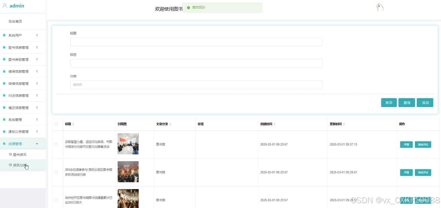 - 资源管理:资源管理功能包括对图书资讯和资讯分类的管理。管理员可以添加、删除和查询图书资讯,以及对资讯分类进行添加、删除和查询操作。管理员还可以查看资讯的评论,确保资讯内容的质量和准确性。这一功能有助于丰富平台内容,提供有价值的资源给用户。