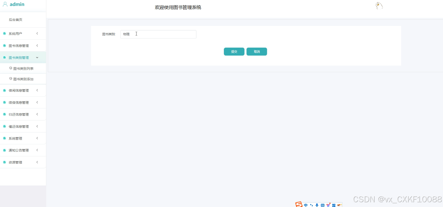 图书类别管理功能允许管理员对图书进行分类管理。管理员可以添加新的图书类别,删除不再使用的类别,以及查询和编辑现有类别的详细信息。图书类别管理添加模块如下图所示。