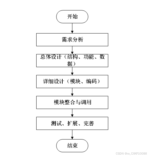 系统开发流程的主要步骤,从需求分析到系统完成的全过程。流程包括需求分析、总体设计(结构、功能、数据)、详细设计(模块、编码)、模块整合与调用,以及测试、扩展和完善,最终完成系统的开发。本系统的开发流程如图3-3所示