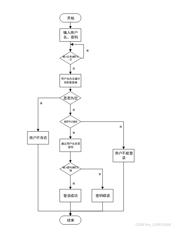 用户输入用户名和密码后,系统先检查输入是否为空,再验证用户名是否存在,若存在则通过用户名获取密码并校验。若密码正确则登录成功,否则提示密码错误。若用户名不存在或无法登录,提示用户操作无效。如图3-4所示。