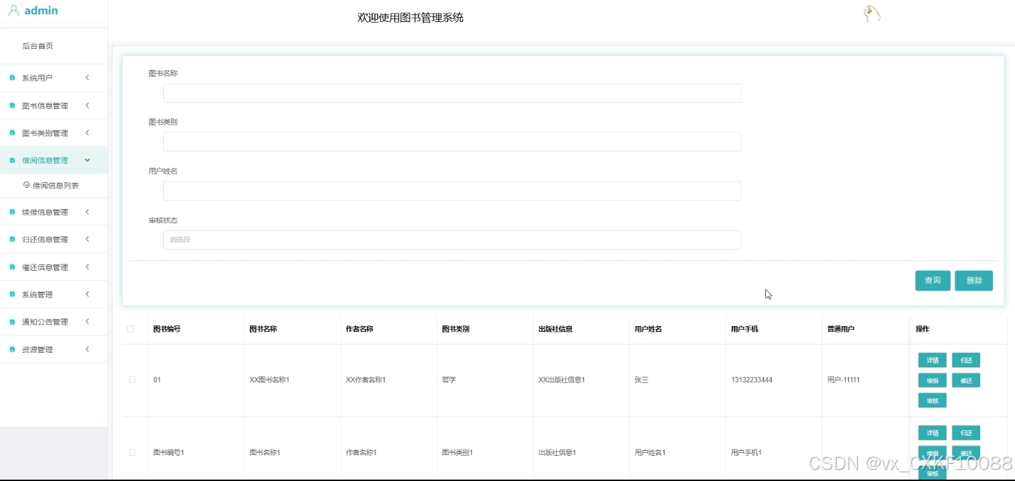 - 借阅信息管理:借阅信息管理功能使管理员能够跟踪和管理用户的借阅活动。管理员可以删除或查询借阅记录,查看借阅详情,审核借阅状态,处理归还、续借和催还事宜。这一功能确保了借阅流程的顺畅和图书资源的有效管理。