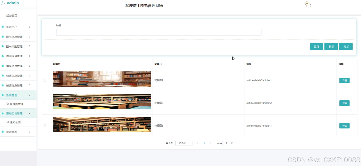 在系统管理模块中,管理员可以对平台的轮播图进行更新,以及进行信息的查询、新增和删除操作。轮播图的更新有助于展示最新活动或通知。轮播图管理模块如下图所示。