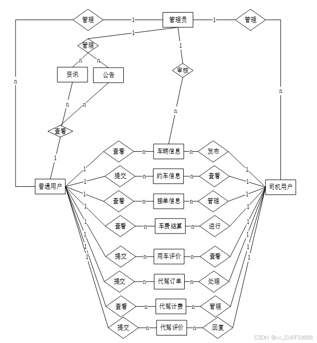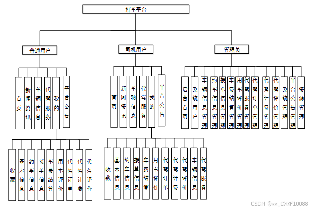 我的(个人信息管理):包括个人信息、收藏、约车信息、接单信息、车费结算、用车评价等内容。