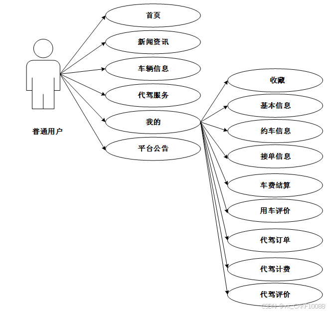 我的(个人信息管理):包括个人信息、收藏、车辆信息、约车信息、接单信息、车费结算、用车评价、代驾服务等内容。