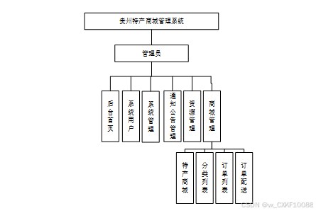 后台功能主要为管理员模块,管理员是系统最高权限拥有者,可管理用户、订单、评价、资讯、公告通知等信息,并保证及时更新系统信息,维护系统正常运行。可发布贵州特产商城信息,处理买家的咨询和下单信息,管理订单,也可进行评价回复订单操作。系统后台功能模块图如下图所示。